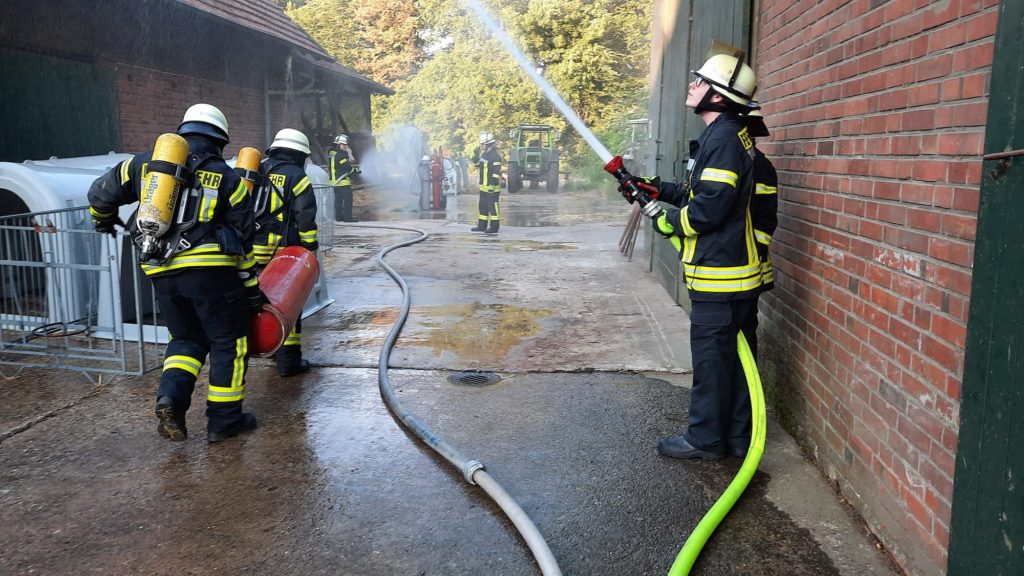 Am Freitag beübten die Kameraden des Löschzuges Burgsteinfurt den landwirtschaftlichen Betrieb der Familie Engbring in Sellen. Im angedachten Szenario brach in der Werkstatt einer Scheune mit angrenzendem Strohlager ein Brand bei Schweißarbeiten aus, wobei zwei Personen im Anschluss vermisst wurden.