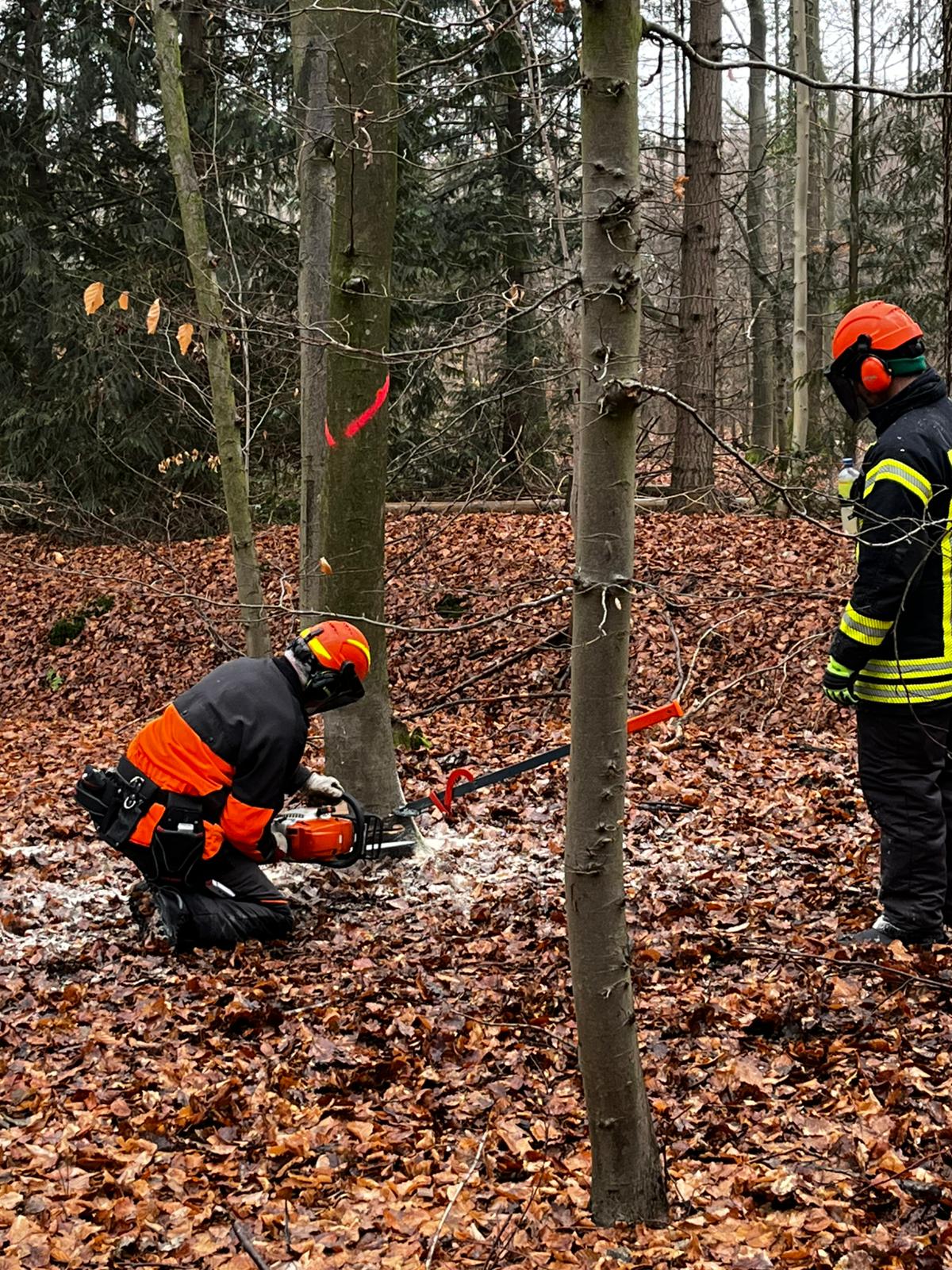 Am Samstag wurden die vermittelten Inhalte dann praktisch vertieft. Unter Anleitung erfahrener Ausbilder trainierten die Teilnehmenden verschiedene Schnitttechniken, das sichere Fällen und Aufarbeiten von Holz sowie den Umgang mit unter Spannung stehendem Material. Besonderes Augenmerk lag dabei stets auf der eigenen Sicherheit und der Zusammenarbeit im Trupp.