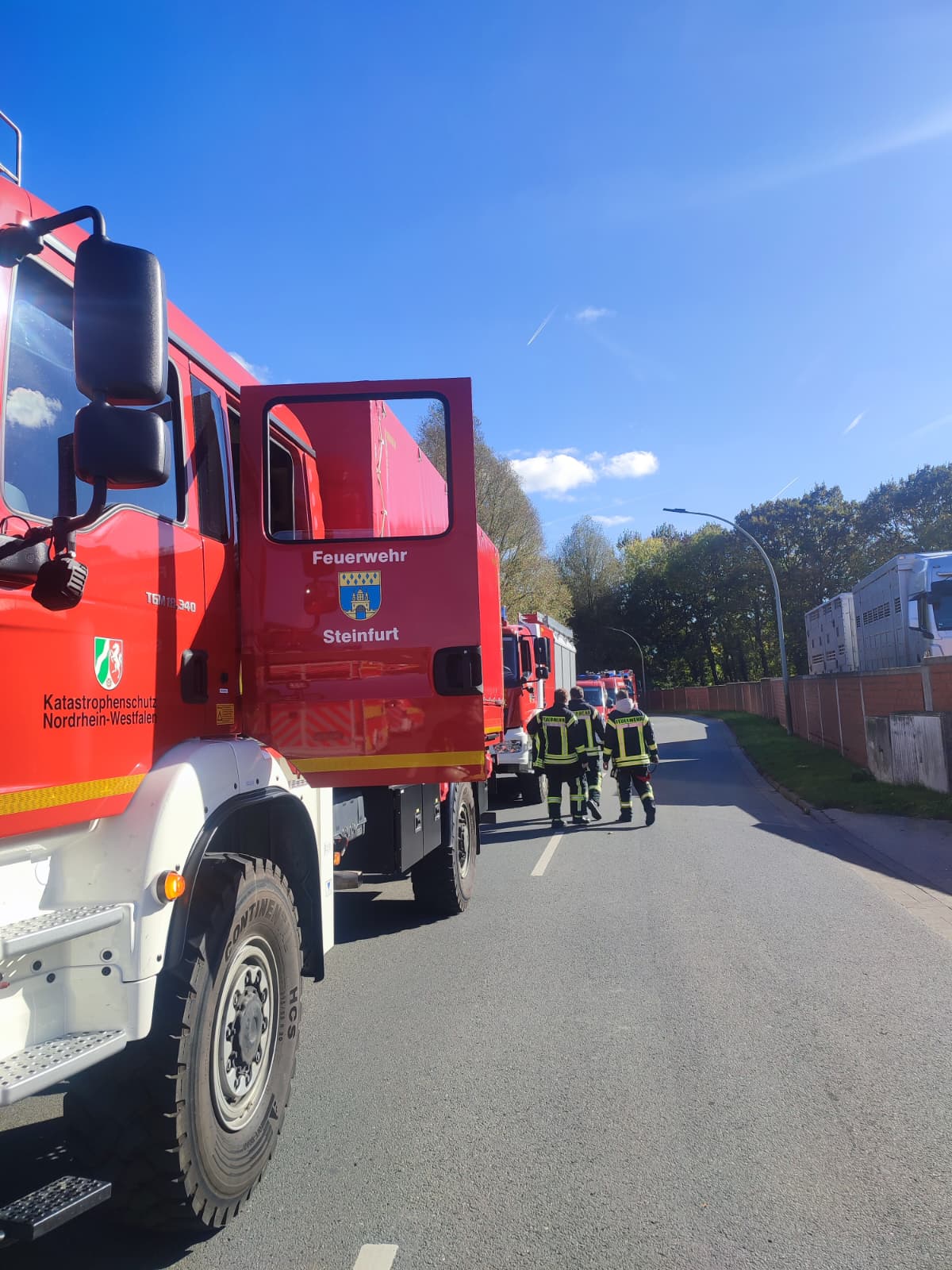 Zu den nachalarmierten Kräften gehört neben ABC-Einheiten aus Rheine, Emsdetten und Neuenkirchen auch die Personal-Dekontaminationseinheit der Feuerwehr Steinfurt. Letztere rückte mit dem Dekon-P und LF20 KatS mit 10 Einsatzkräften an.