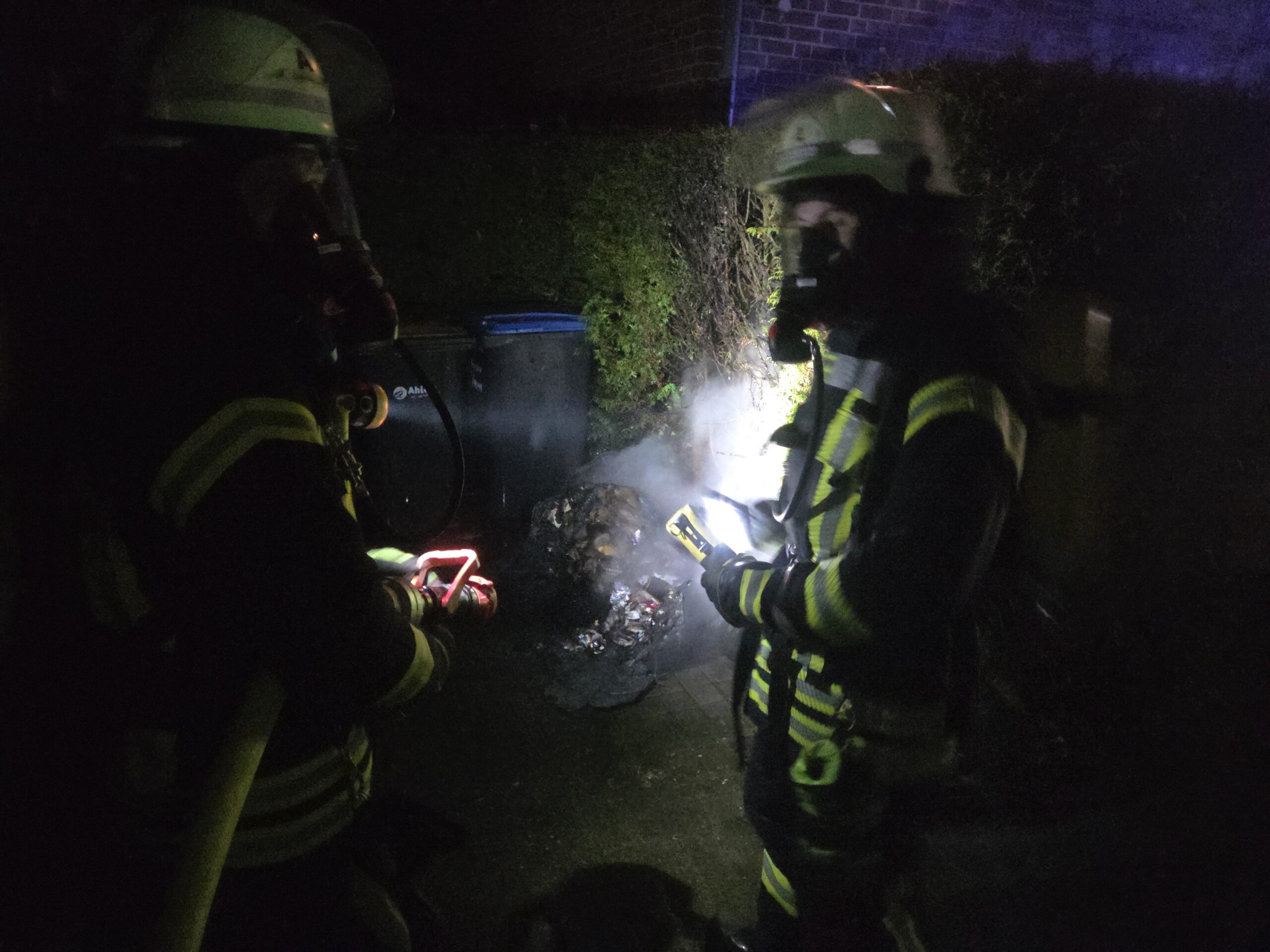 An der Emmausstraße brannten 2 Mülltonnen. Durch das LF10 Borghorst wurde ein C-Rohr unter Atemschutz vorgenommen. Mittels Dunghaken konnte das Brandgut auseinander gezogen und der Brand gelöscht werden.