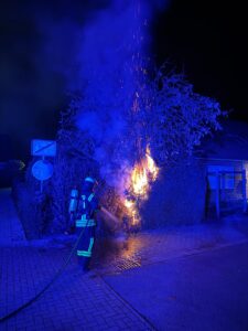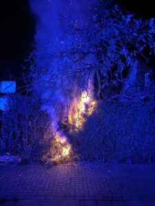 Zum Laudamm wurde die Feuerwehr zu einem brennenden Busch alarmiert. Die Feuerwehr rückte mit dem Dienstbetrieb aus und ging mittels schweren Atemschutz und Schnellangriff vor und löschte den Brand.